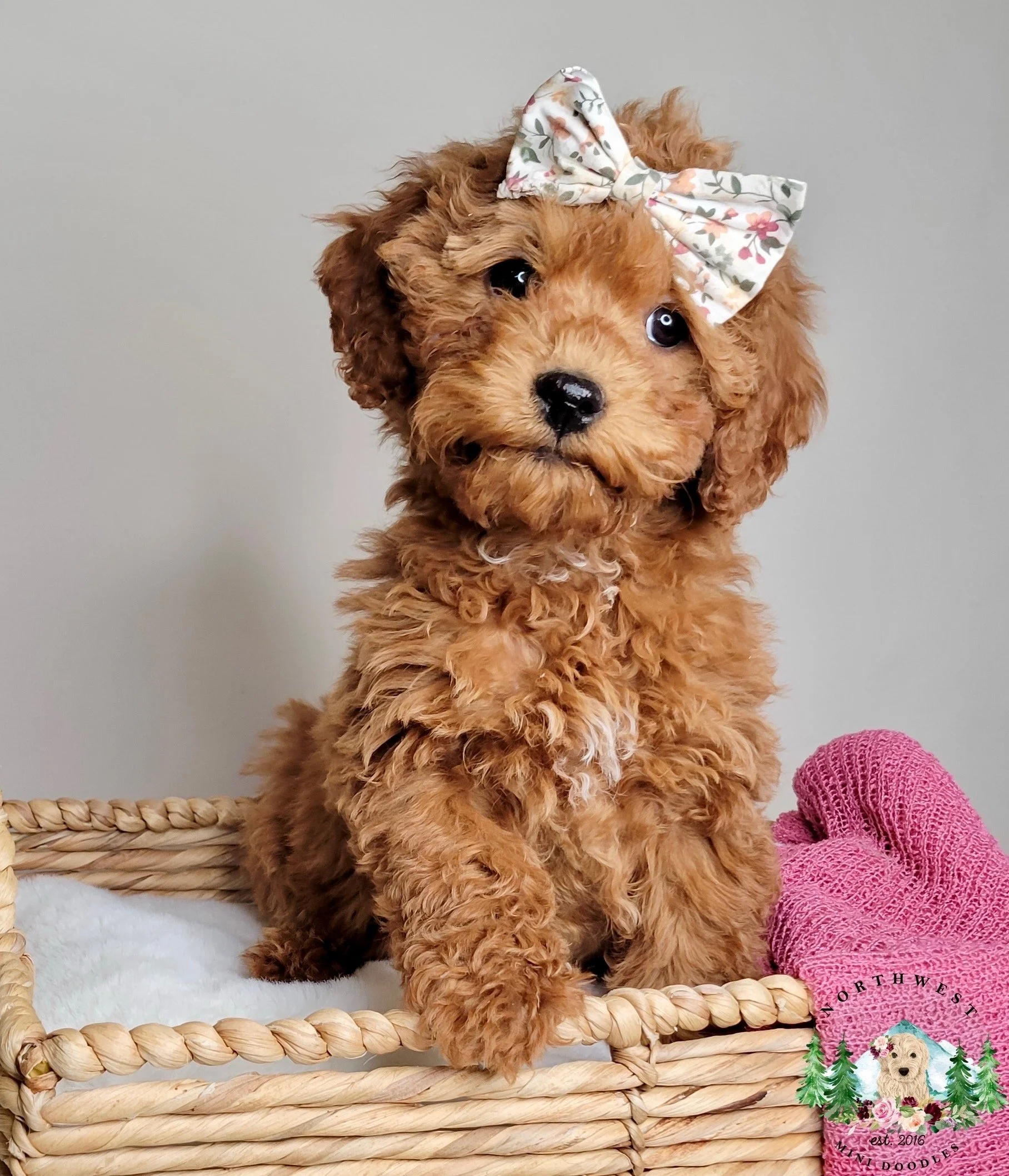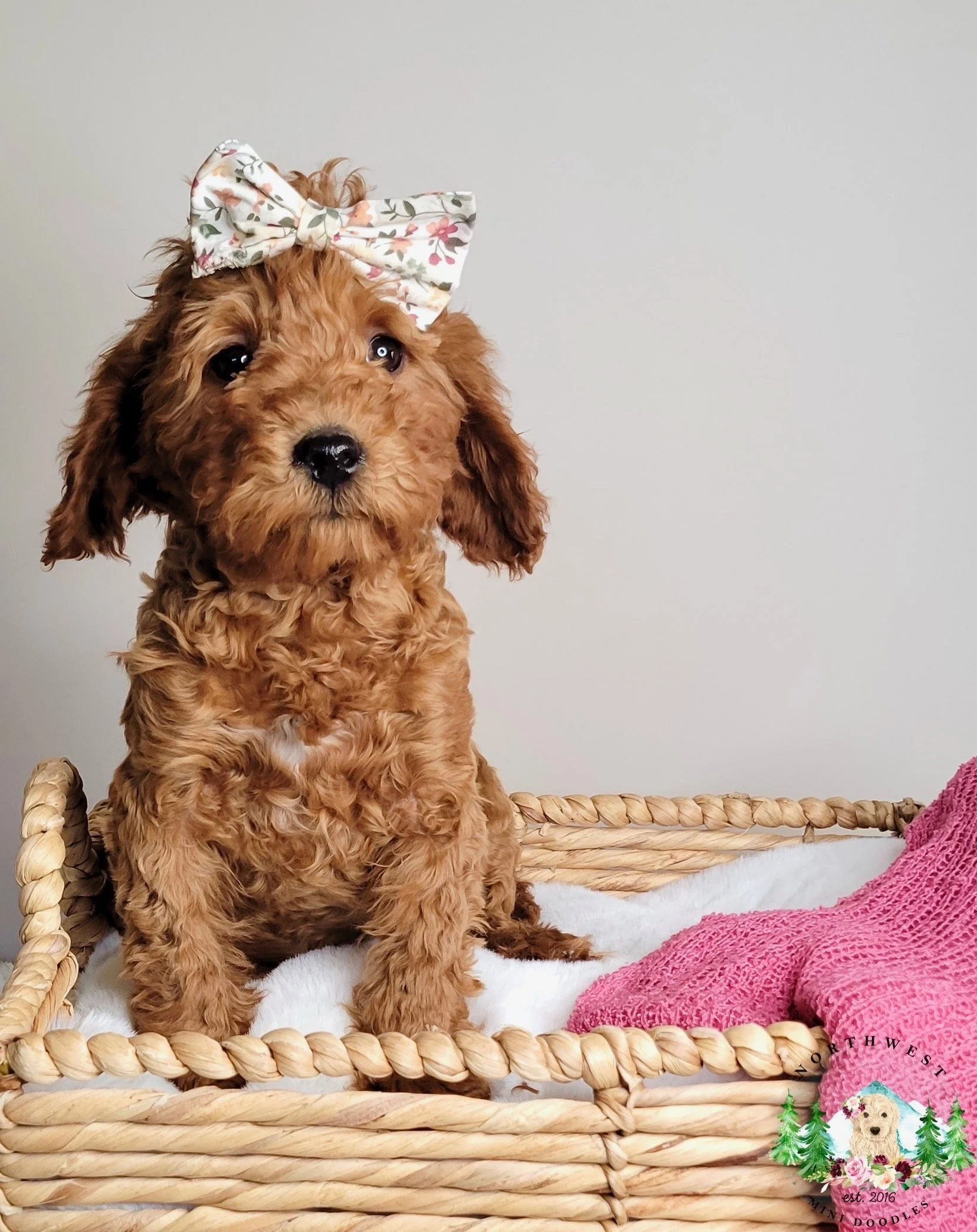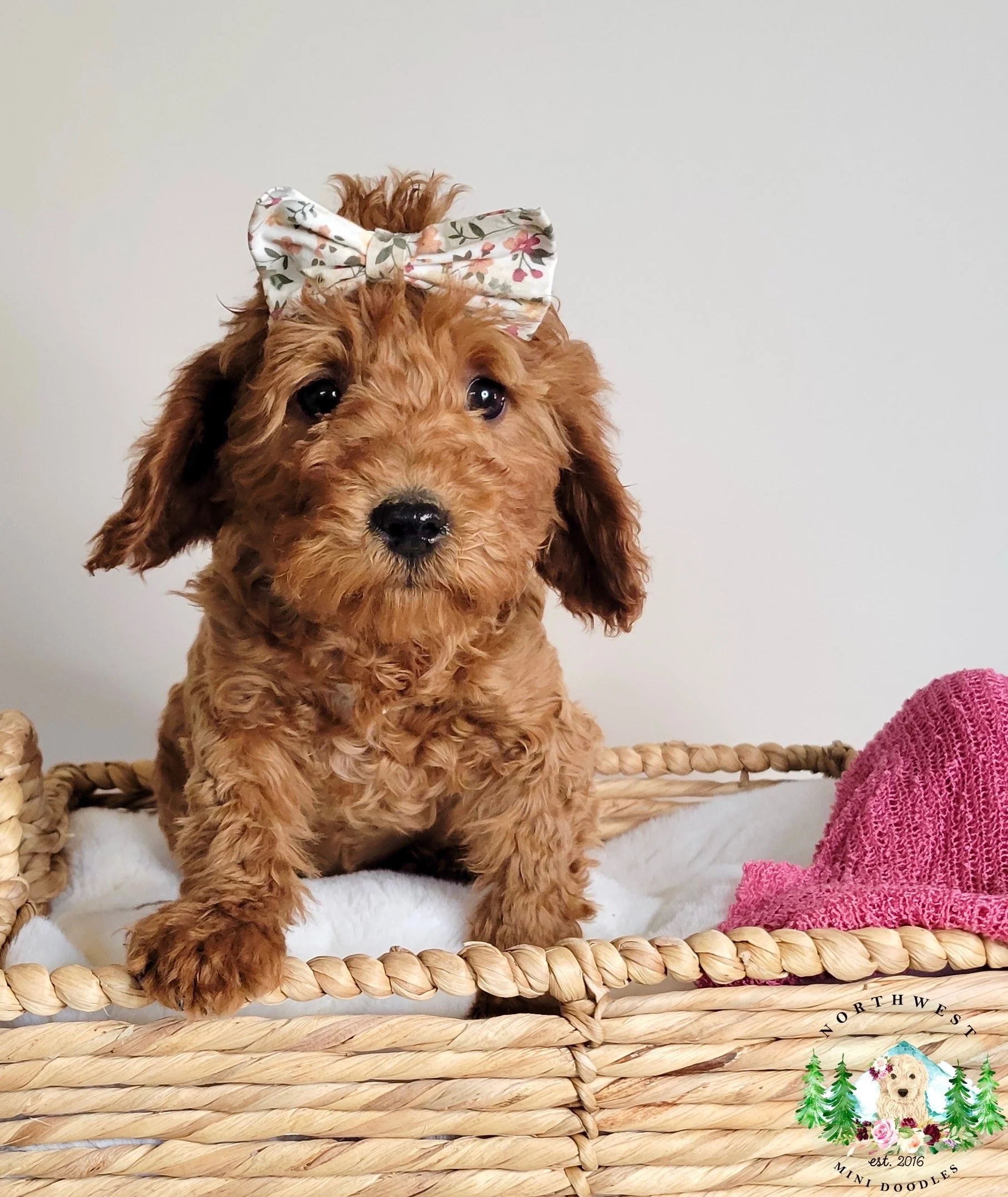 Dark red female with curly coat. Estimated adult weight of 17 pounds. Up to date on vaccines and exams. Ready for her forever home. $2,000.