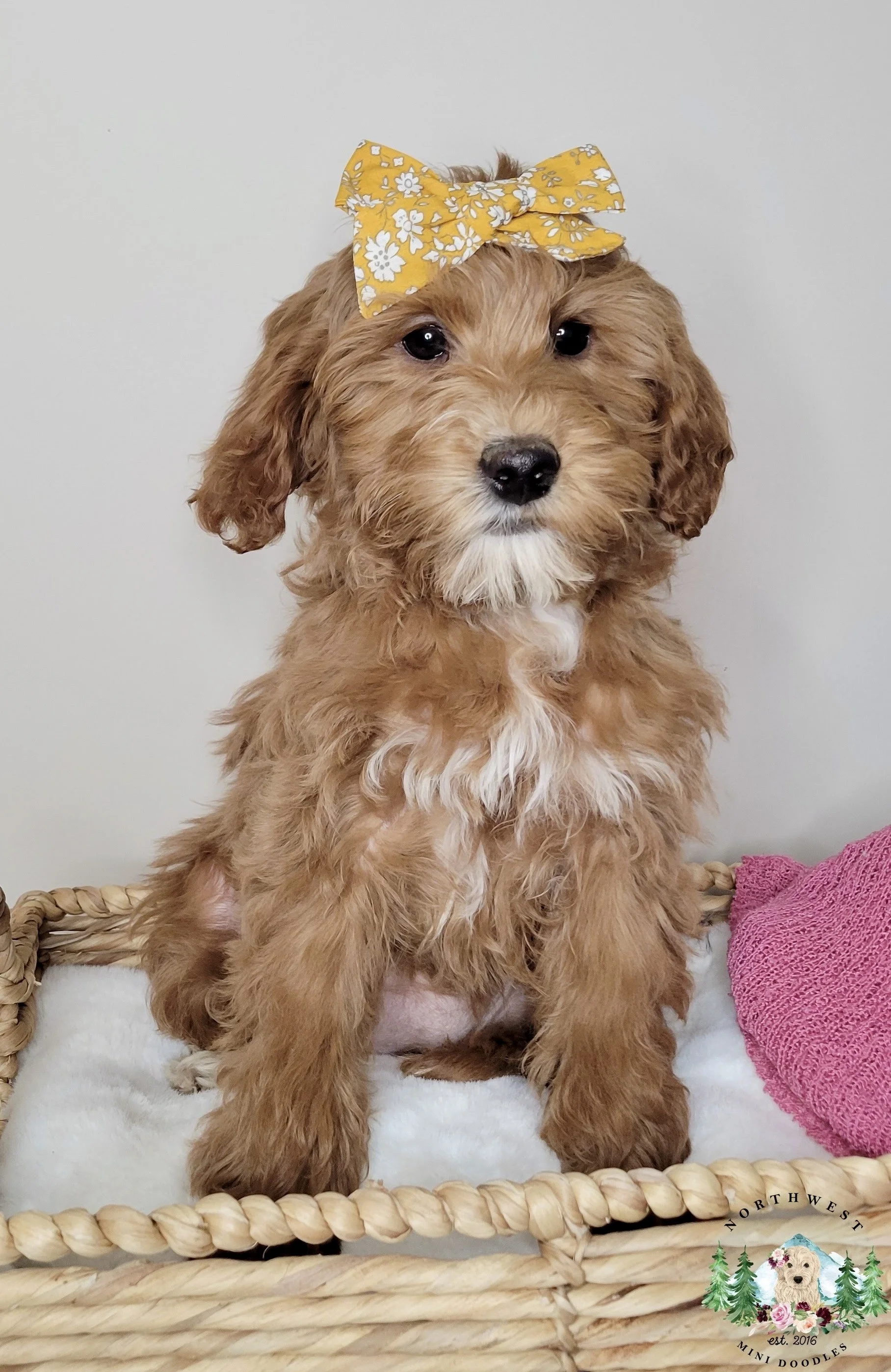 Beautiful golden color female with curly coat and white accents. Estimated adult weight of 17 pounds. Up to date on vaccines and exams. Ready for her forever home. $2,000.